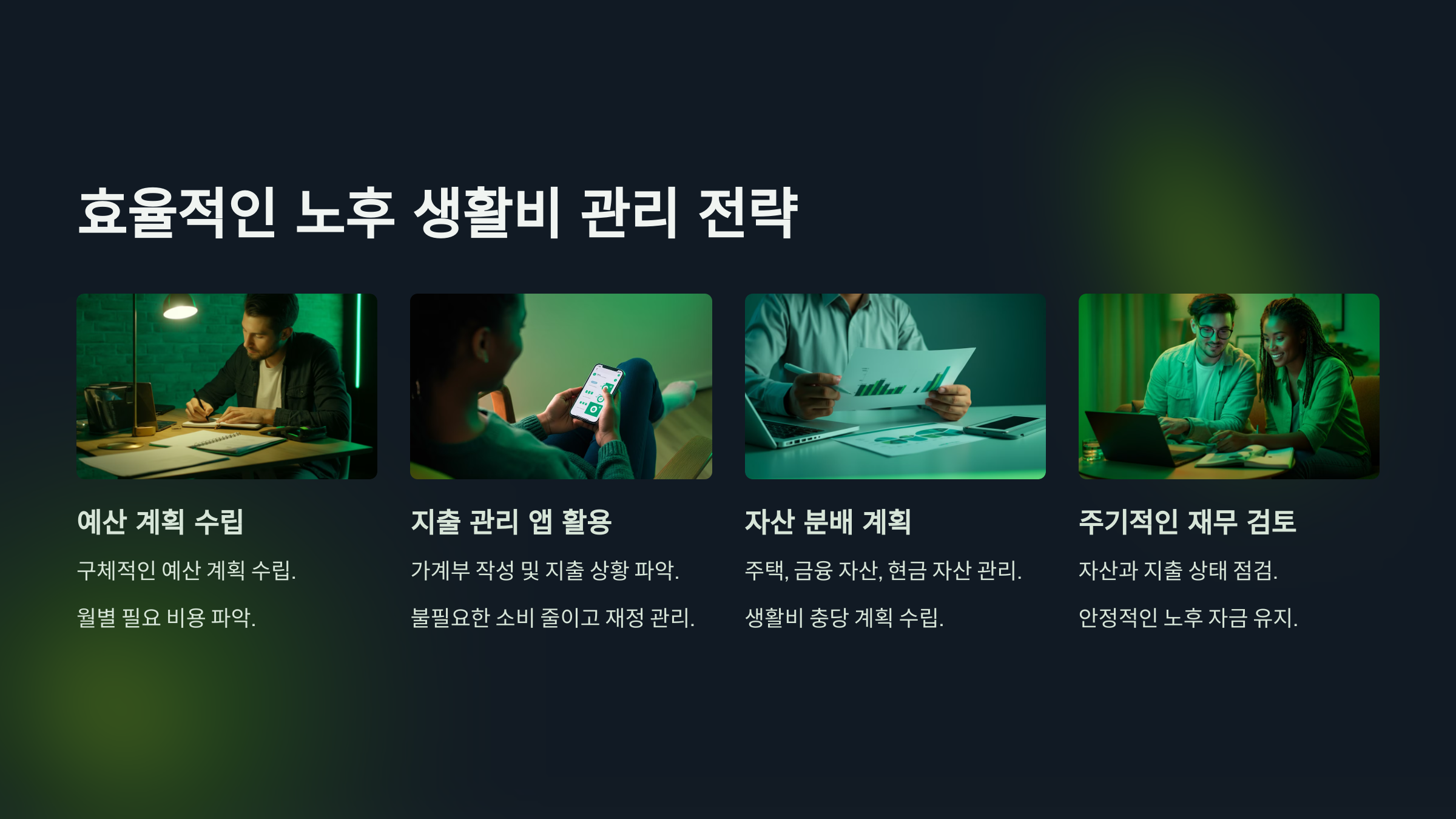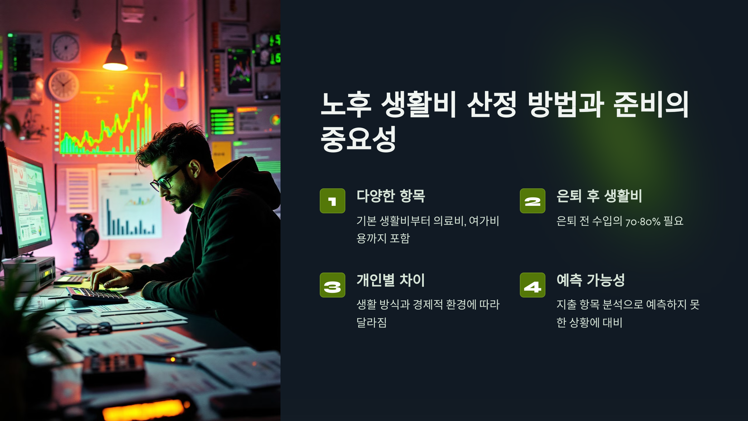 노후 생활비는 주거비, 의료비, 여가비용 등 다양한 항목을 포함하여 장기적인 준비가 필요합니다. 본문에서는 구체적인 생활비 산정법과 절약 전략을 설명합니다.