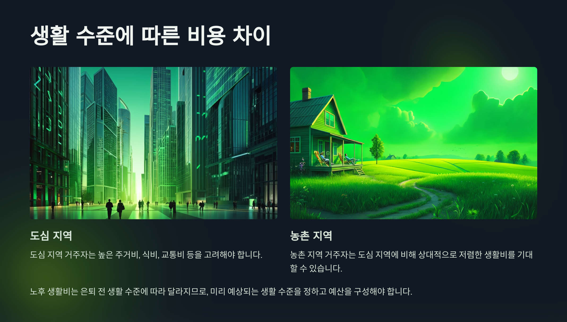 노후 생활비는 주거비, 생활비, 의료비 등 다양한 지출 항목으로 구성되며, 예상치 못한 비용을 고려해 생활 수준에 맞는 예산을 마련하는 것이 중요합니다.