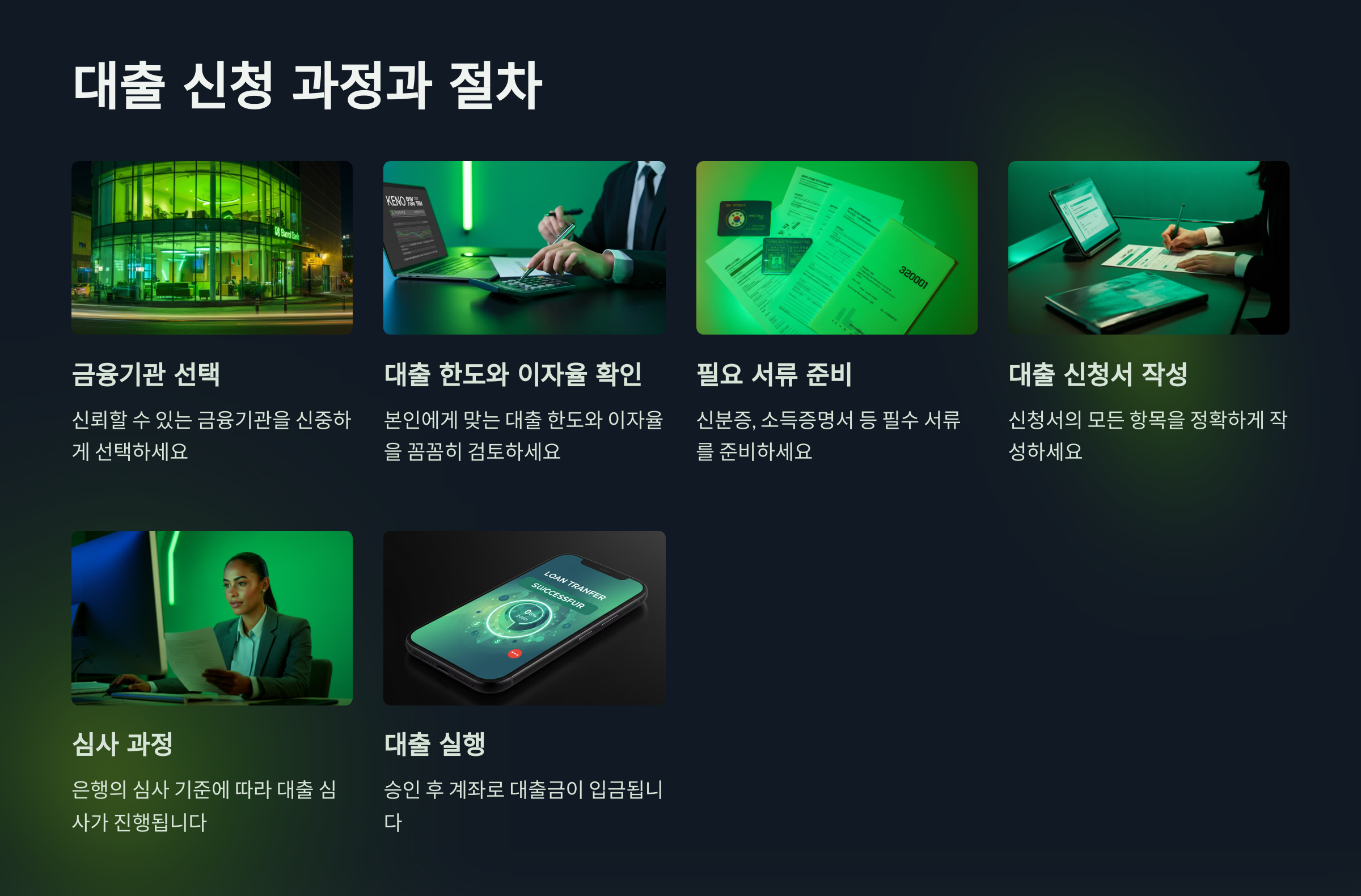 대출 신청은 금융기관 선택, 신청서 작성, 심사 등의 단계를 포함합니다.