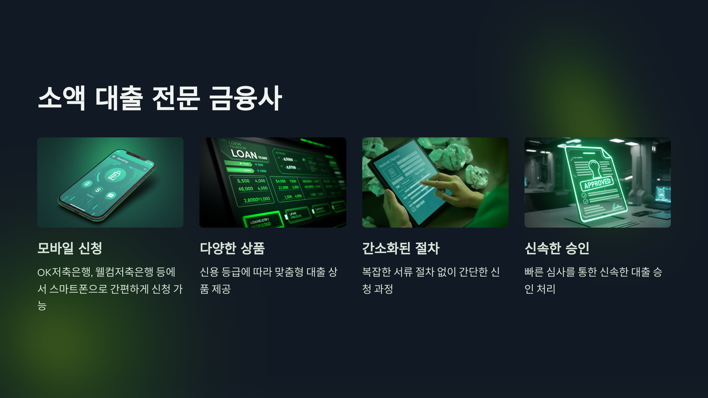 소액 대출 전문 금융사: OK저축은행, 웰컴저축은행 등은 신용 등급에 따라 다양한 옵션을 제공합니다.