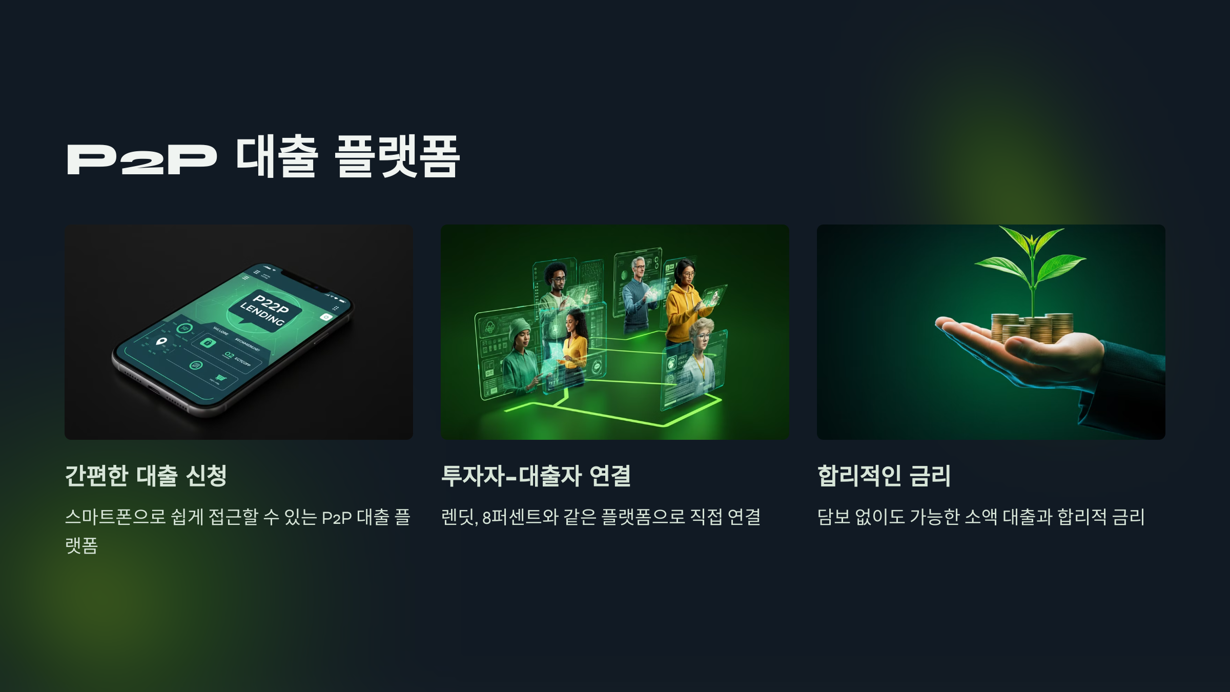 P2P 대출 플랫폼: 렌딧, 8퍼센트 등은 합리적인 금리로 소액 대출이 가능합니다.