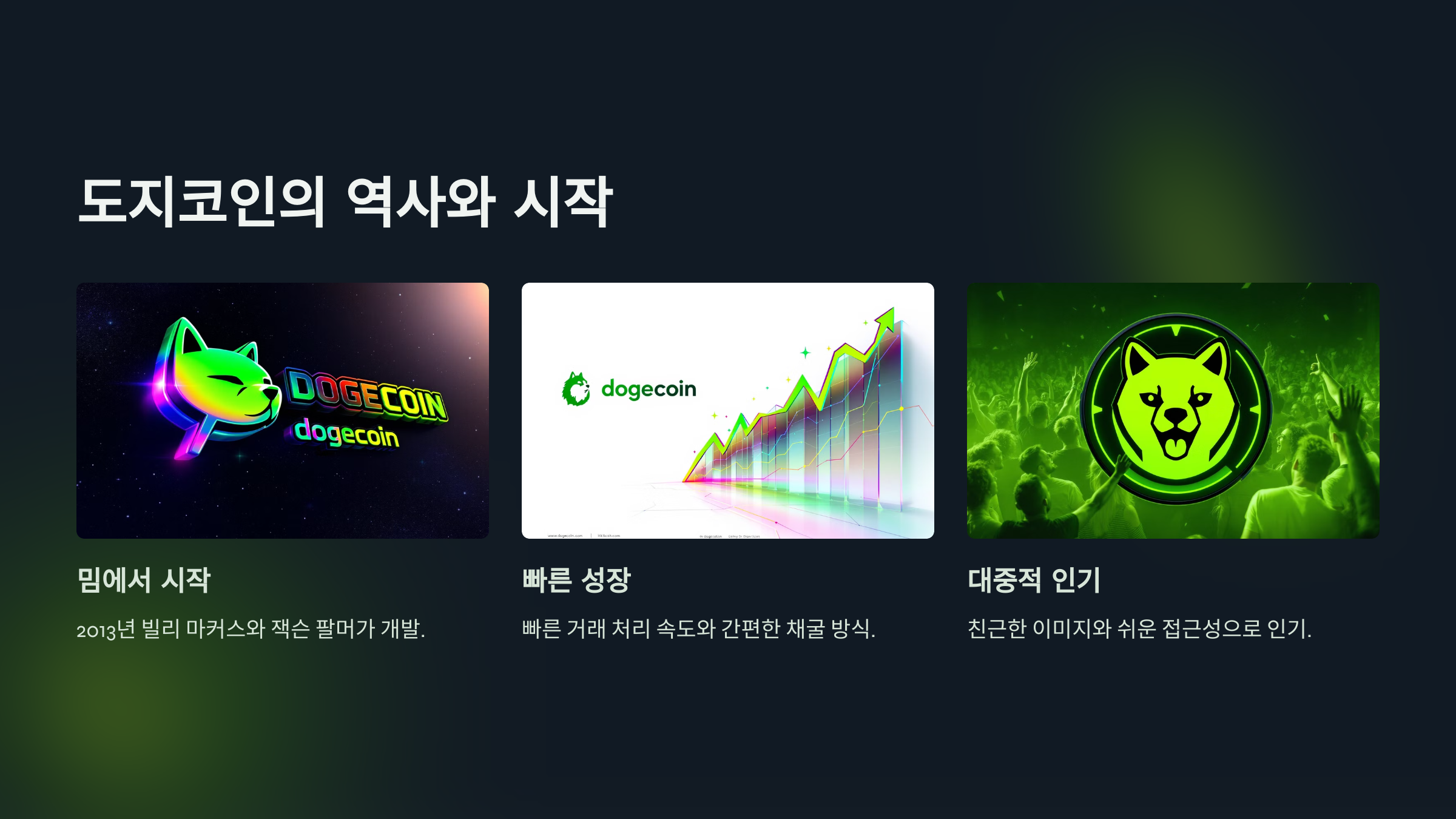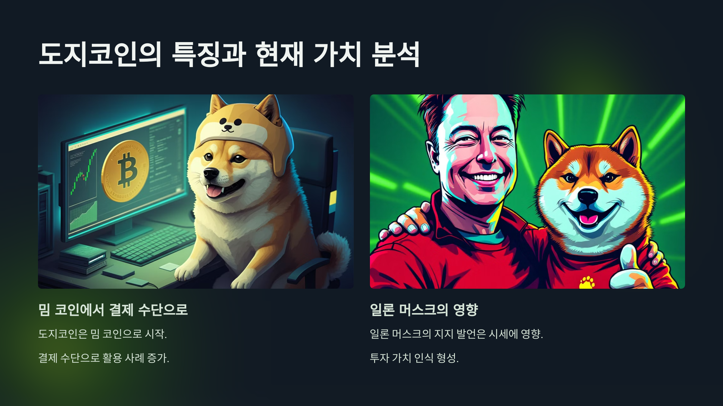 도지코인은 저렴한 가격과 높은 접근성으로 유명하며, 일론 머스크의 지지 발언 이후 큰 주목을 받고 있습니다.