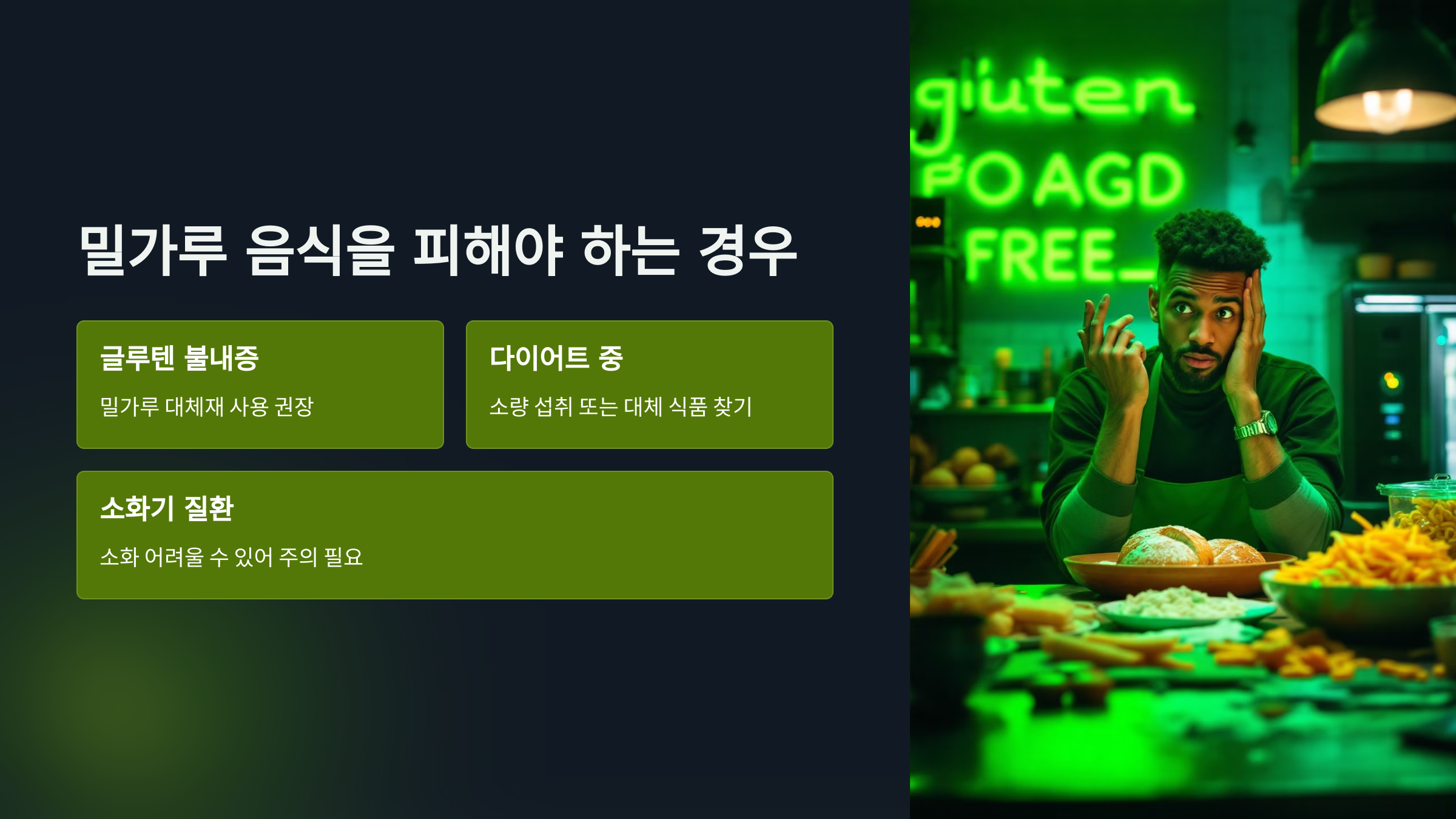 - 글루텐 불내증: 밀가루에 포함된 글루텐이 소화기관에 문제를 일으키는 경우 밀가루 대체재를 사용하는 것이 좋습니다.