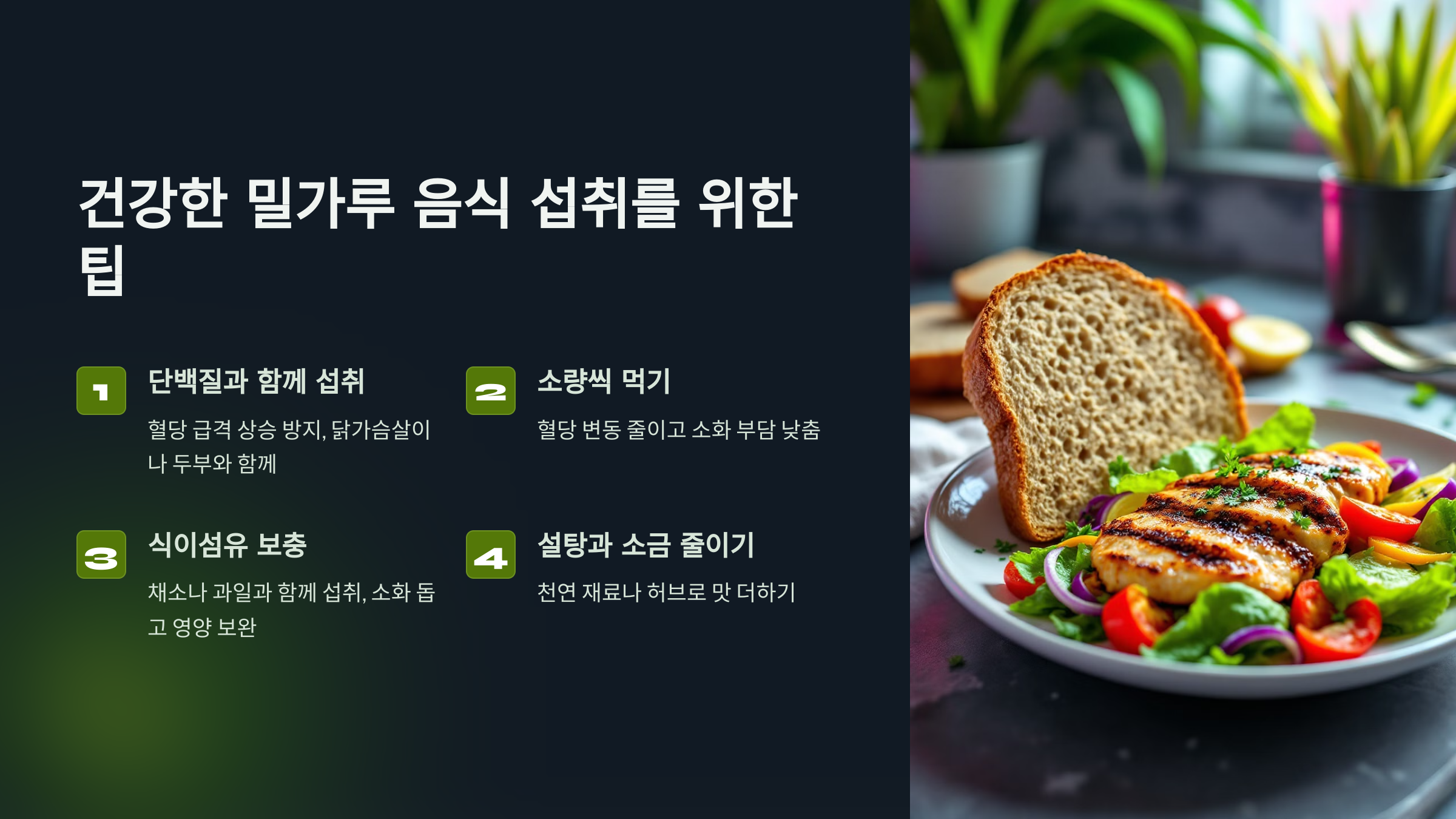 - 식이섬유 보충: 밀가루 음식은 섬유질이 부족할 수 있으므로 채소나 과일과 함께 섭취해 소화를 돕고 영양을 보완하는 것이 좋습니다.