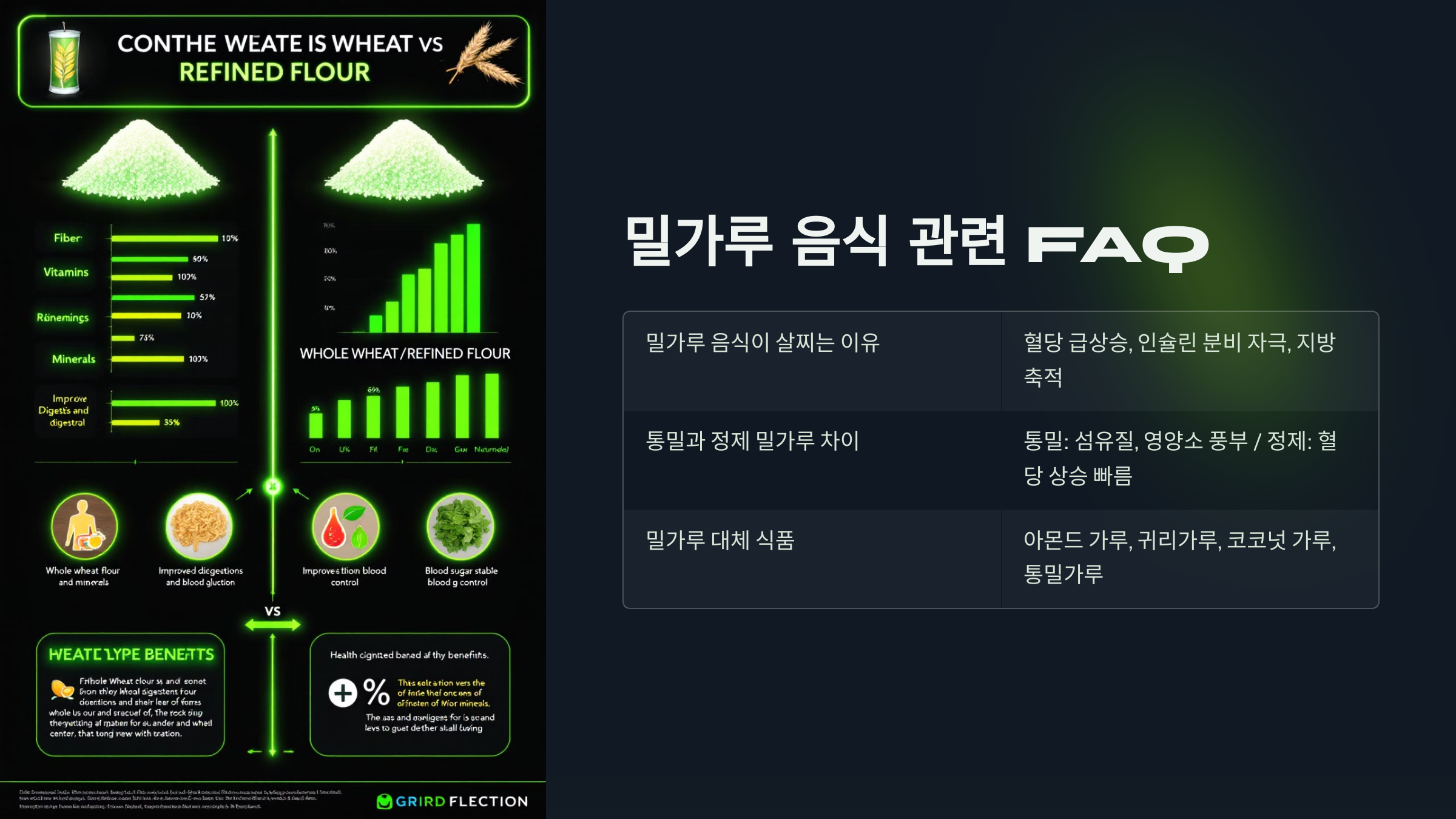 A2. 통밀가루는 밀의 껍질과 씨앗을 포함해 섬유질과 영양소가 풍부하지만, 정제 밀가루는 껍질을 제거해 혈당 상승 속도가 빠릅니다.