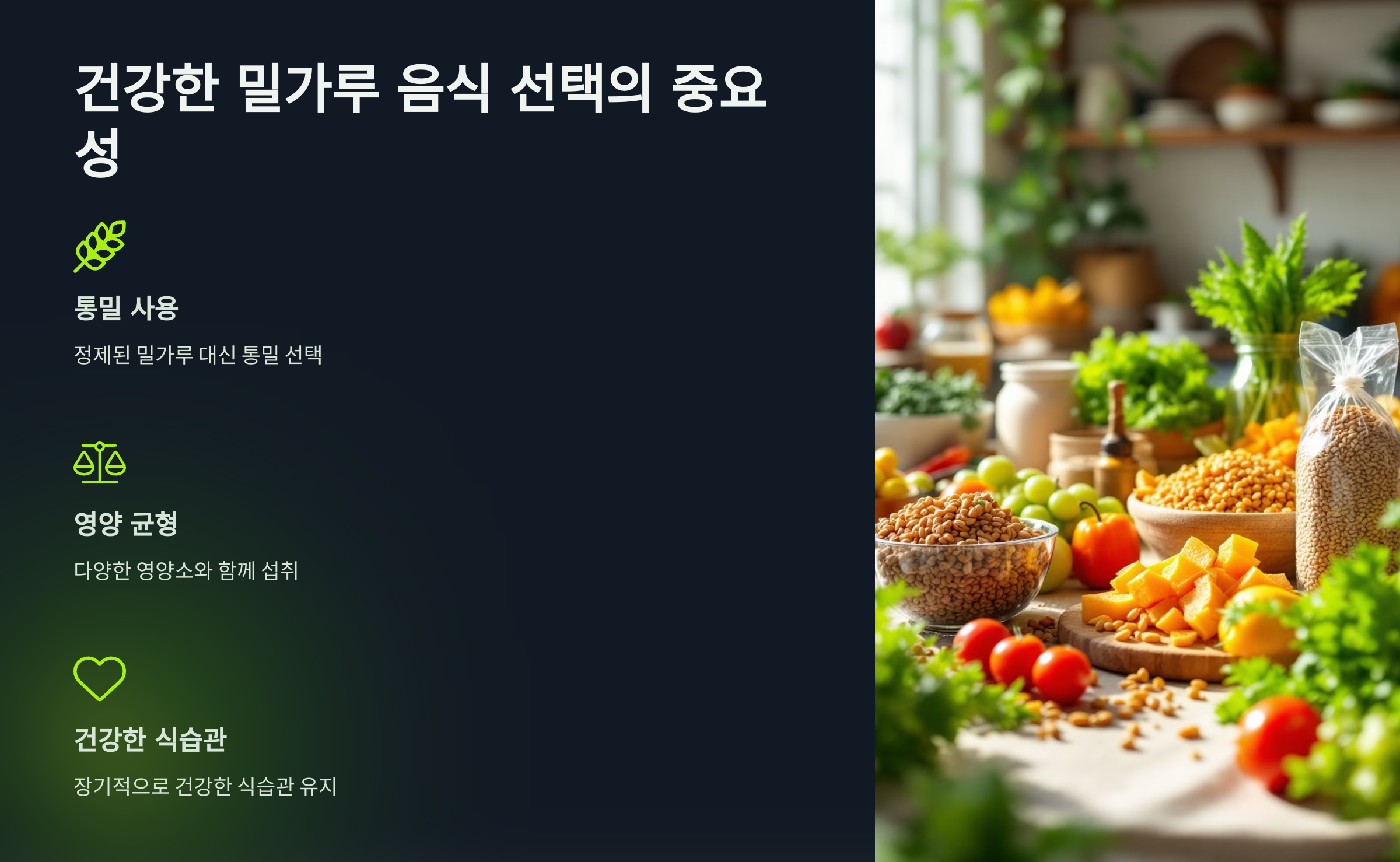 - 설탕과 소금 줄이기: 밀가루 음식에 설탕이나 소금을 많이 사용하면 건강에 좋지 않으므로, 이를 줄이고 천연 재료나 허브로 맛을 더하는 것이 좋습니다.