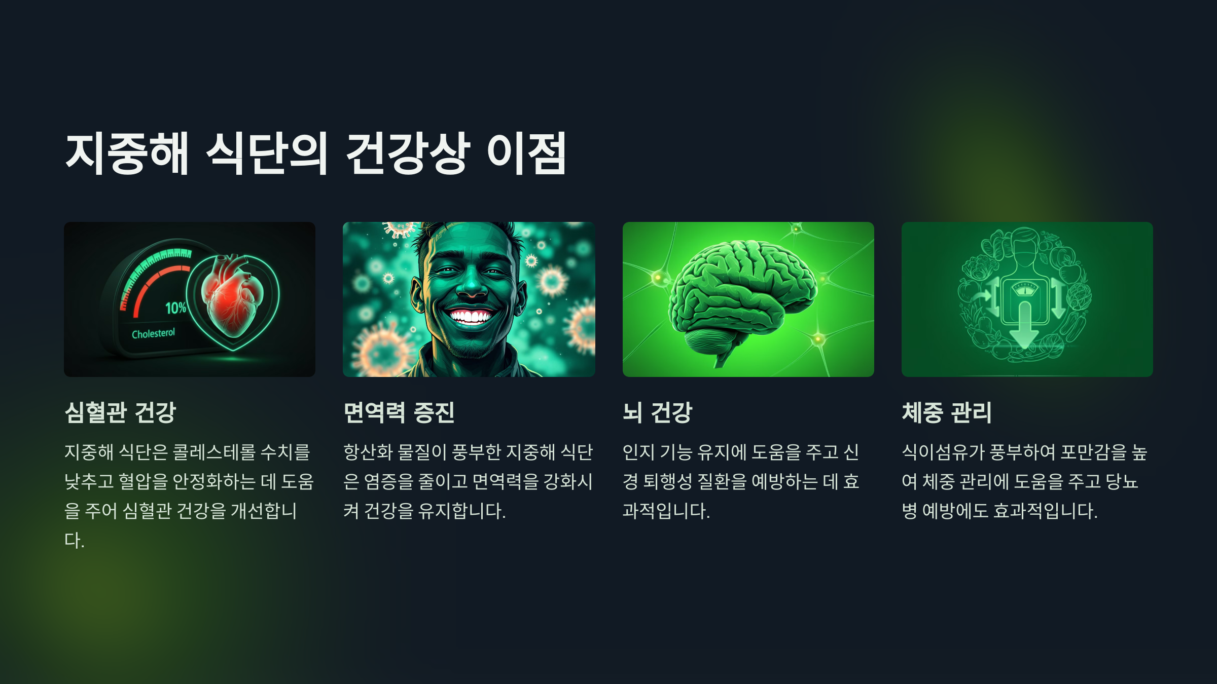 오메가-3 지방산이 풍부한 생선과 항산화 성분이 많은 채소, 과일은 뇌 세포를 보호해 인지 기능을 유지하고, 알츠하이머병과 같은 신경 퇴행성 질환 예방에 도움을 줍니다. 지중해 식단은 정신 건강에도 긍정적인 영향을 미치며, 스트레스를 완화시키고 인지 능력을 향상시키는 효과가 있습니다.