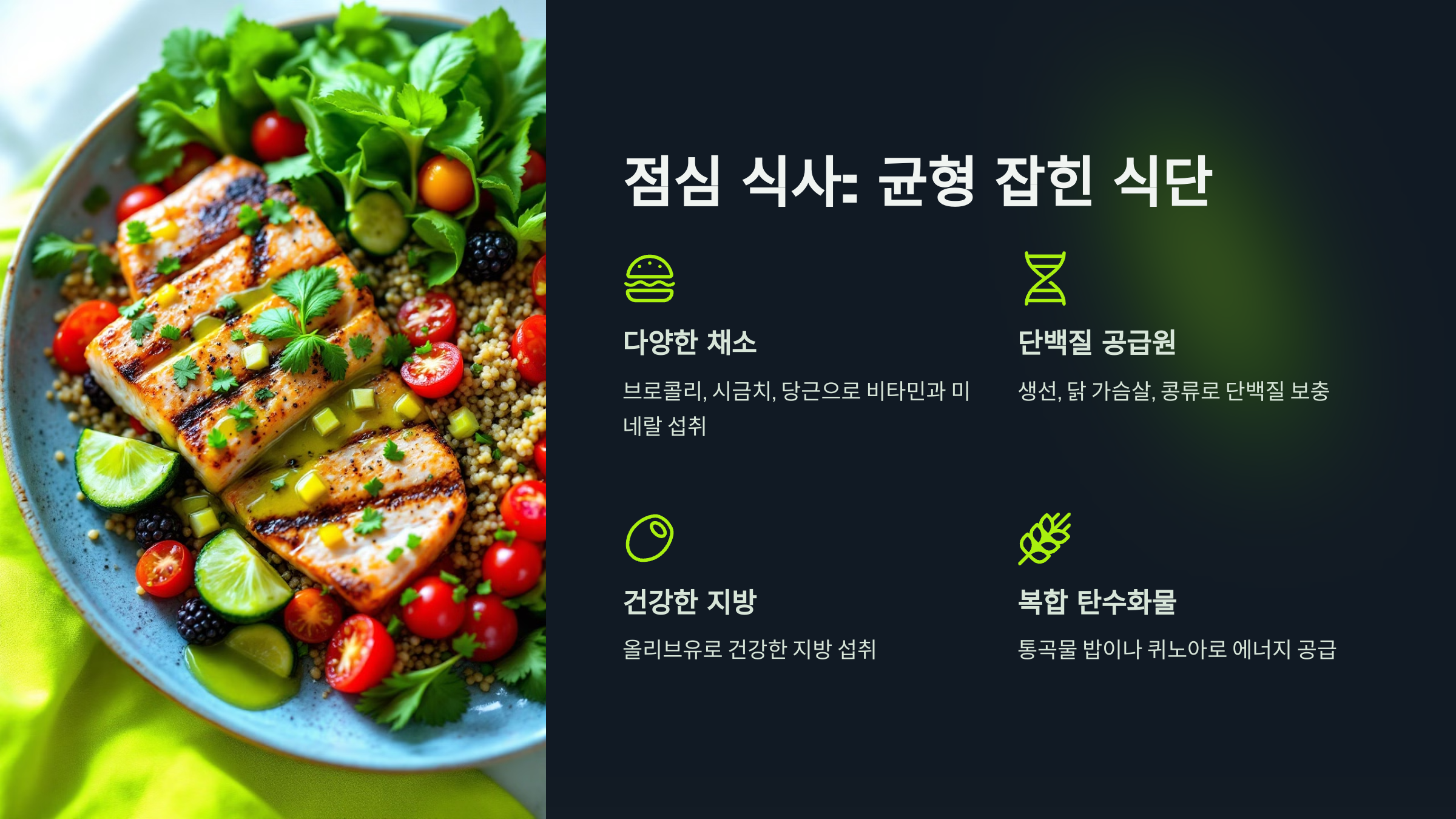 점심에는 신선한 채소와 단백질이 균형 잡힌 식단이 중요합니다. 할머니는 브로콜리, 시금치, 당근 등 다양한 색상의 채소를 사용하는 것을 선호하며, 이를 통해 비타민과 미네랄을 충분히 섭취합니다. 이와 함께, 단백질 공급원으로는 생선, 닭 가슴살, 혹은 콩류를 선택합니다. 생선의 경우 오메가-3 지방산이 풍부하여 심혈관 건강에도 좋은 영향을 미치며, 콩류는 식물성 단백질과 함께 섬유질을 공급해줍니다. 또한 적절한 양의 올리브유로 드레싱을 하여 건강한 지방을 첨가하는 것도 잊지 않습니다. 통곡물 밥이나 퀴노아 같은 복합 탄수화물은 혈당을 급격히 올리지 않으면서 에너지를 공급해주는 역할을 합니다.