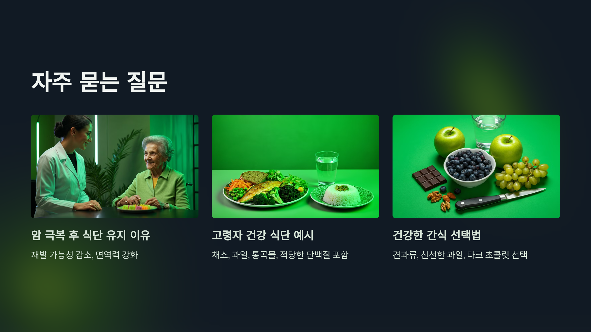 A: 암을 극복한 후에도 재발 가능성을 줄이기 위해 건강한 식단을 유지하는 것이 중요합니다. 항산화 성분이 풍부한 음식과 균형 잡힌 영양소 섭취는 면역력을 강화하며, 건강한 생활 습관은 신체 회복을 돕고 전반적인 건강을 유지하는 데 큰 도움을 줍니다.