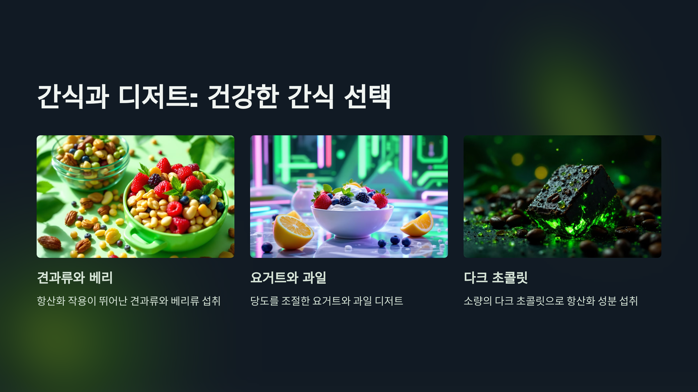 A: 간식은 당분이 높은 간식보다 견과류, 신선한 과일, 다크 초콜릿 같은 항산화 성분이 많은 간식을 선택하는 것이 좋습니다. 적당히 섭취하면 에너지를 보충하면서도 건강에 좋은 간식이 될 수 있습니다.