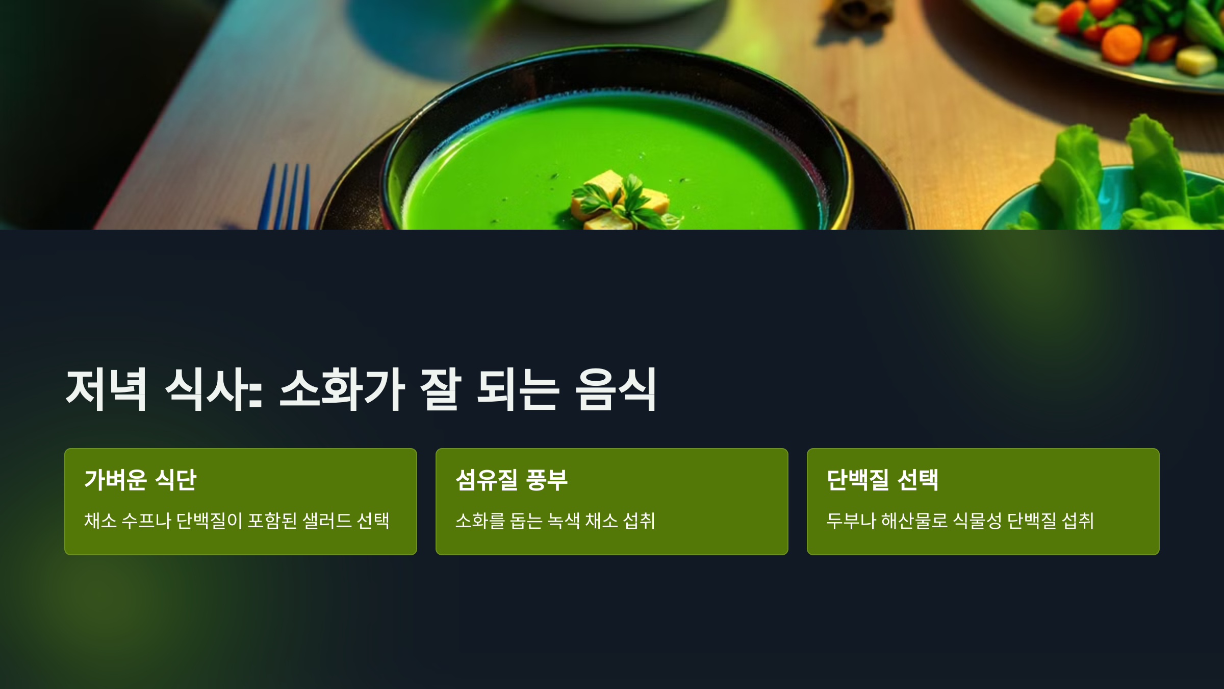 저녁에는 특히 소화에 부담이 적은 음식을 선택하는 것이 중요합니다. 할머니는 저녁에 채소 수프나 단백질이 적당히 포함된 샐러드를 즐기며, 가벼운 식단을 지향합니다. 저녁에는 과도한 칼로리를 피하고, 소화를 돕기 위해 섬유질이 풍부한 채소를 많이 섭취합니다. 할머니는 주로 단백질이 적당히 포함된 두부 샐러드나 해산물 수프를 선택하며, 여기에 상추나 케일 같은 녹색 채소를 풍부하게 넣어 포만감을 높입니다. 이 외에도 구운 채소나 찐 채소를 추가하여 식사에 다채로운 맛을 더하고 소화가 쉽게 되도록 합니다. 저녁에는 특히 고기보다도 소화가 쉬운 해산물이나 두부 등의 식물성 단백질을 선호합니다.