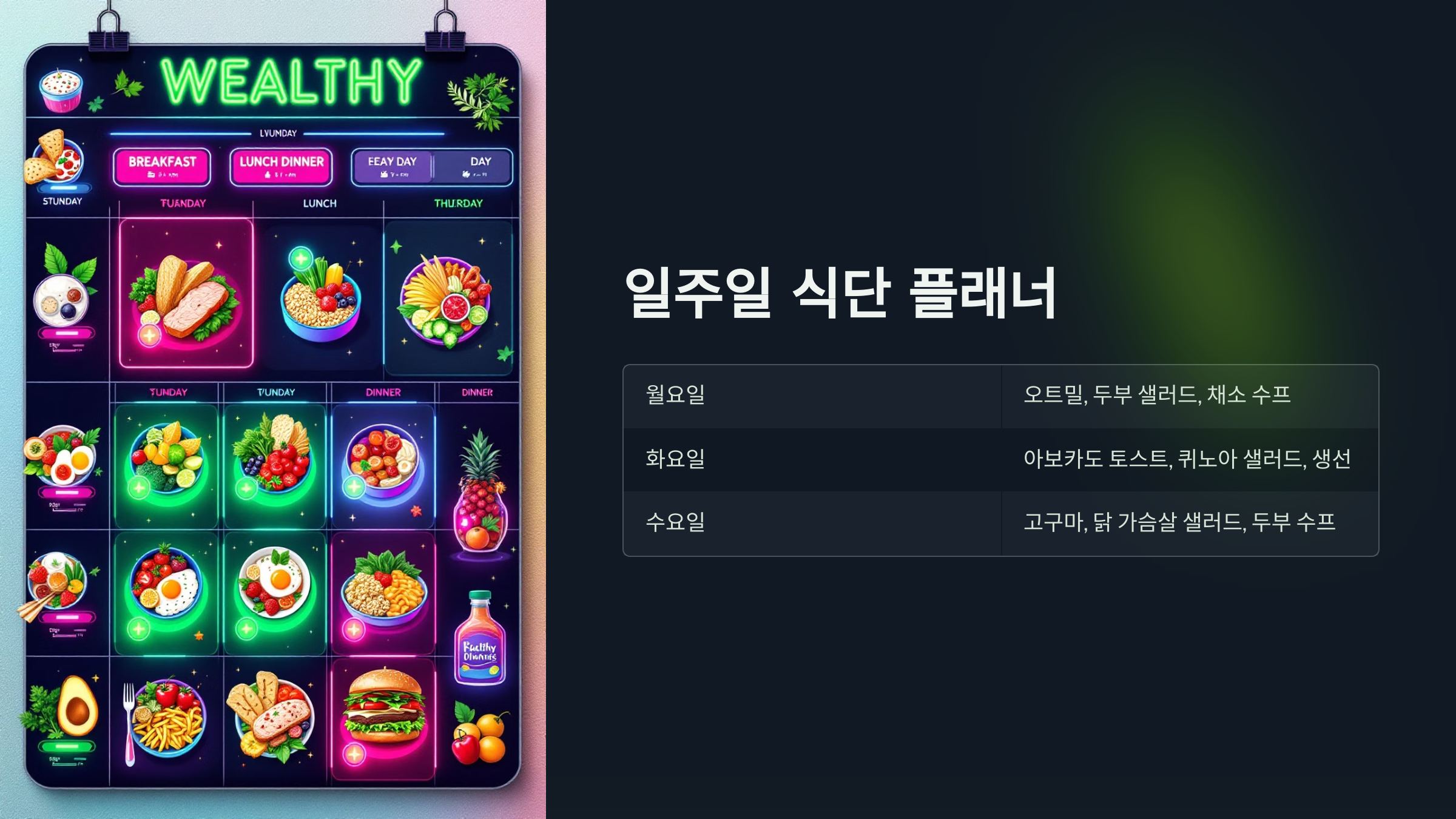 할머니의 일주일 식단 플래너는 매일 다른 음식을 섭취하여 다양한 영양소를 제공하고, 식단의 질을 높이는 것이 특징입니다. 월요일 아침에는 오트밀과 베리류, 점심에는 채소와 두부 샐러드, 저녁에는 채소 수프와 함께 구운 감자를 먹습니다. 화요일에는 통곡물 토스트와 아보카도를 아침에 먹고, 점심에는 퀴노아 샐러드를, 저녁에는 생선과 찐 채소를 곁들입니다. 수요일에는 고구마와 그릭 요거트로 아침을 시작하고, 닭 가슴살 샐러드를 점심에, 그리고 저녁에는 채소와 두부 수프를 섭취합니다. 이러한 방식으로 일주일 내내 균형 잡힌 식단을 유지하여 지루함 없이 영양소를 골고루 섭취할 수 있습니다.