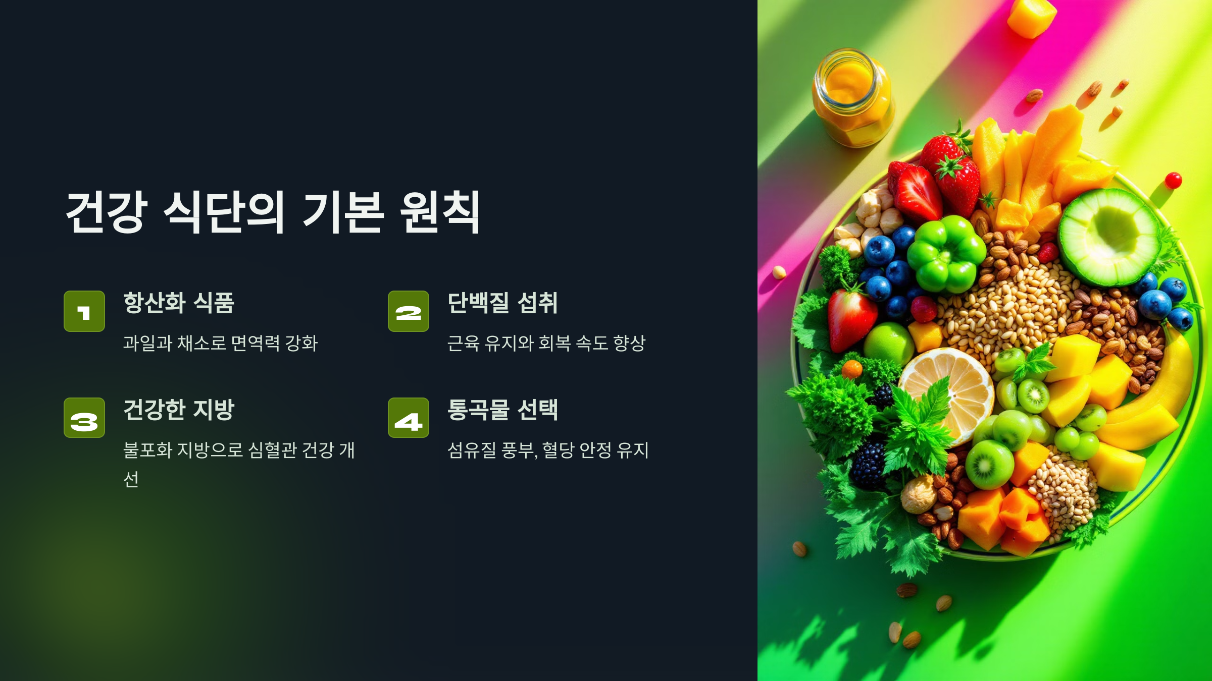 건강한 식단의 핵심 원칙은 단순히 칼로리를 줄이는 것이 아니라 영양소가 풍부한 식품을 골고루 섭취하는 것입니다. 할머니가 강조하는 건강 식단의 기본 원칙은 다음과 같습니다: 첫째, 항산화 작용을 하는 과일과 채소를 매일 섭취하여 면역력을 강화합니다. 항산화 성분은 세포 손상을 예방하고, 암의 재발 가능성을 낮추는 데 도움을 줍니다. 둘째, 적정량의 단백질을 섭취하여 근육을 유지하고 회복 속도를 높입니다. 단백질은 특히 고령층의 근육 손실을 예방하는 데 필수적입니다. 셋째, 포화지방과 트랜스지방을 피하고 건강한 지방을 섭취합니다. 견과류나 올리브유 같은 불포화 지방은 심혈관 건강에 긍정적 영향을 미치며, 세포의 건강을 유지하는 데 중요합니다. 마지막으로 정제된 탄수화물보다 섬유질이 풍부한 통곡물을 섭취하여 소화를 돕고 혈당을 안정적으로 유지합니다.
