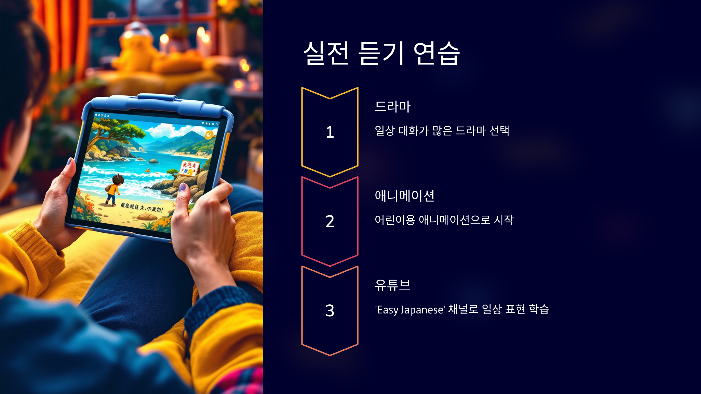 - 일본 드라마 및 애니메이션: 초급 단계에서는 어린이용 애니메이션이나 일상 대화가 많은 드라마를 선택하세요.