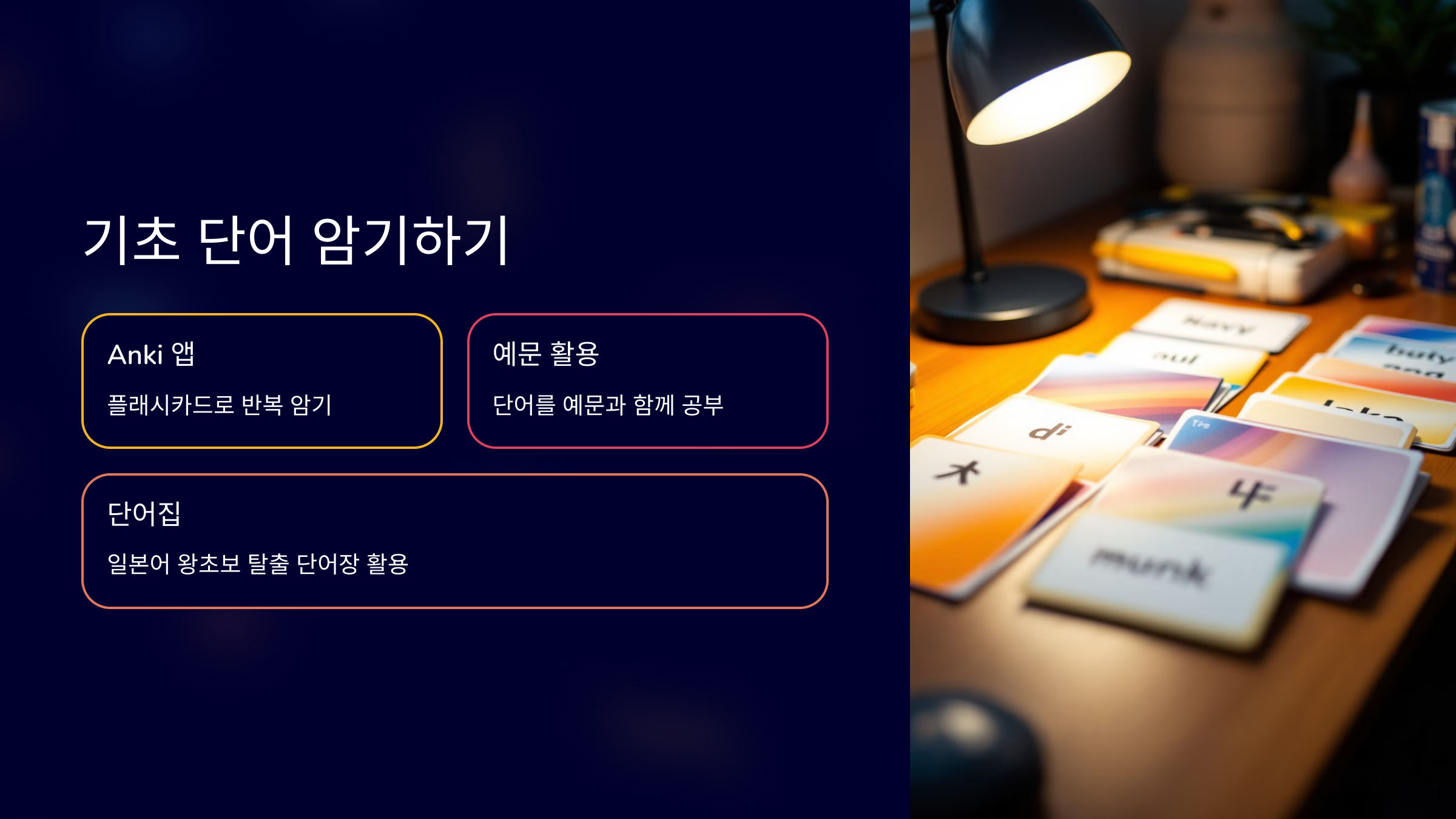 - 앱 'Anki'와 플래시카드: 기본 단어장을 만들어 반복해서 암기할 수 있습니다. 일본어 단어를 외울 때는 예문과 함께 공부하면 기억에 더 오래 남습니다.