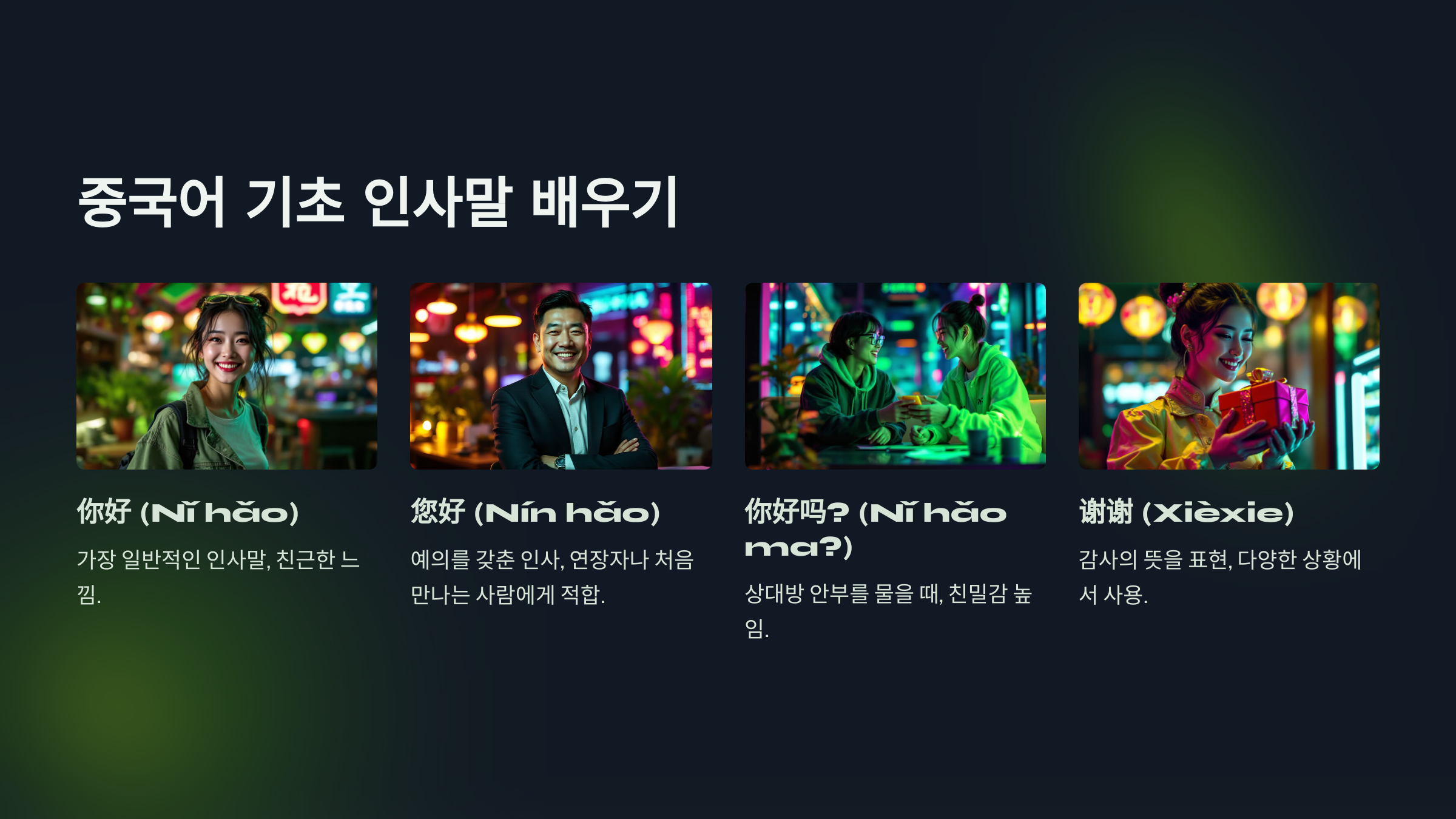 - [니 하오]: 가장 일반적인 인사말로, 친근한 느낌을 전달할 때 사용합니다.