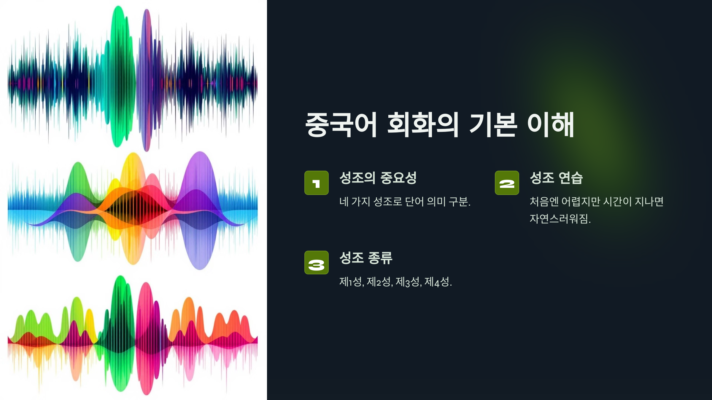 중국어 회화에서 성조는 매우 중요한 요소입니다. 중국어는 하나의 단어가 네 가지의 성조를 가지고 있으며, 성조에 따라 단어의 의미가 크게 달라집니다. 예를 들어, “마”라는 음을 제1성으로 발음할 때와 제3성으로 발음할 때 각각 '엄마'와 '말'을 뜻하게 됩니다. 따라서 중국어를 처음 배우는 사람이라면 성조를 정확하게 연습하는 것이 중요합니다. 성조 연습은 처음엔 어려울 수 있지만, 시간이 지남에 따라 자연스러워질 것입니다.