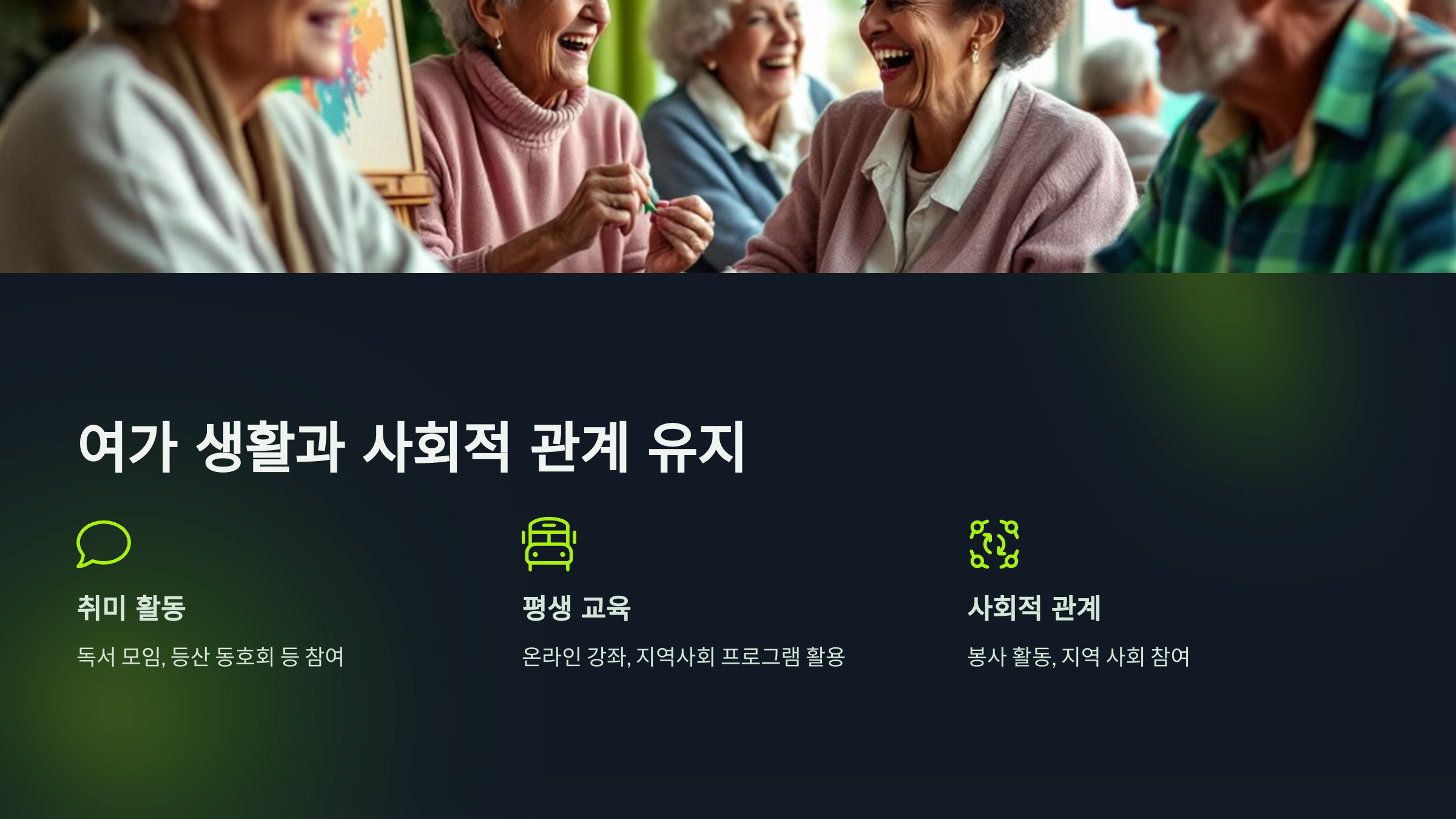 A7. 독서, 등산, 봉사 활동 등 사회적 관계를 유지할 수 있는 활동이 좋습니다.
