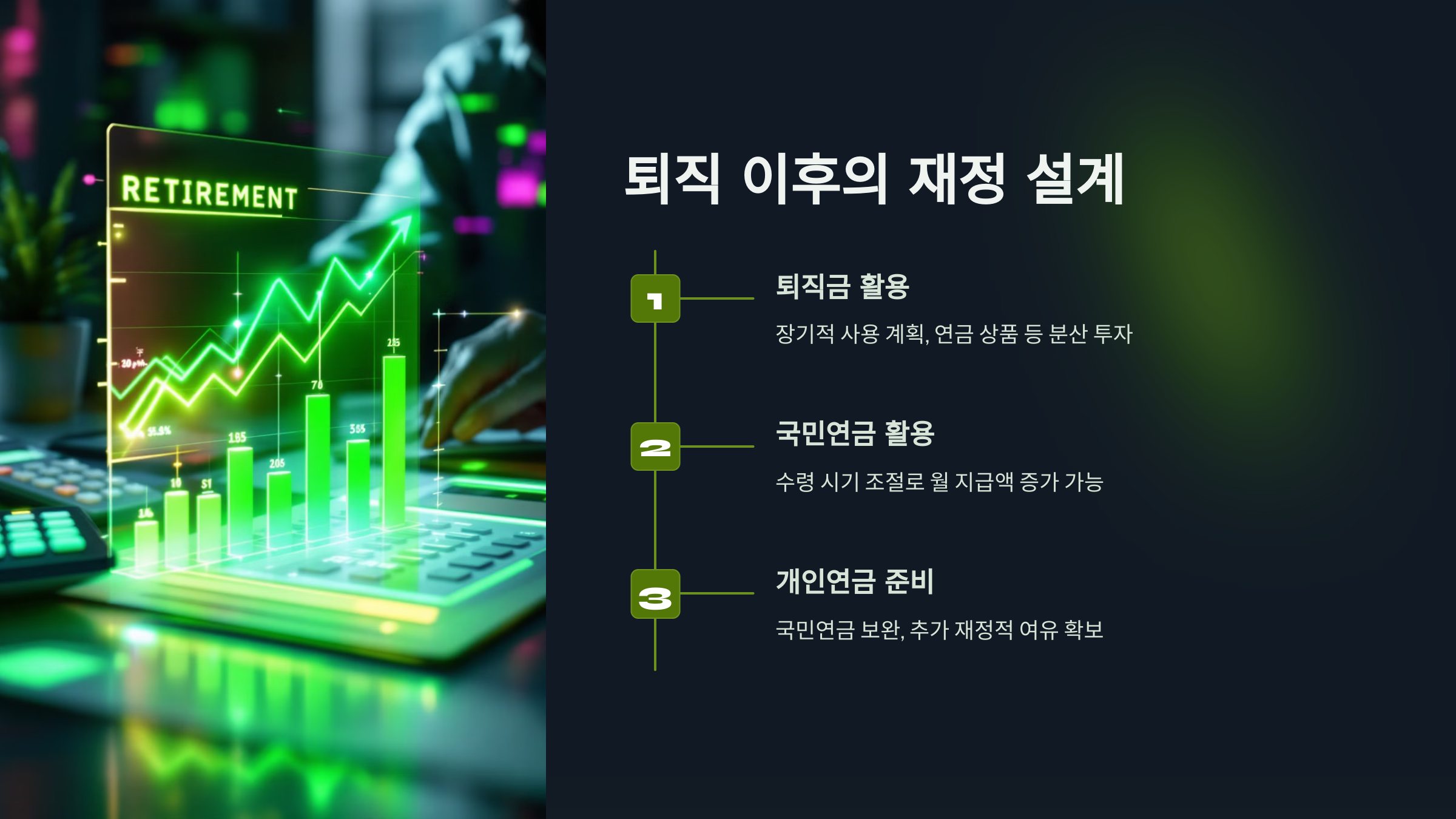 노후 준비를 위해 퇴직 이후 재정 계획이 필수입니다. 퇴직금을 일시에 소비하지 않고, 장기적인 관점에서 분산 투자하여 자산을 천천히 증식하는 전략을 추천드립니다.