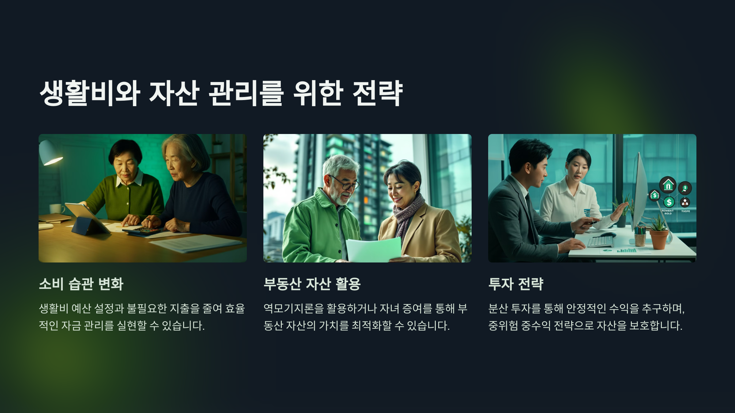 고정적인 수입이 줄어들므로 생활비를 절감하는 습관이 필요합니다. 생활비 예산을 설정하고 고정비 절감을 통해 자산을 효율적으로 관리할 수 있도록 해야 합니다.